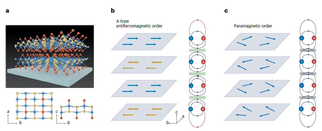 圖2展示了磁序?qū)ΧS磁鐵中電子-空穴對的調(diào)制作用。圖a為二維半導(dǎo)體磁性材料CrSBr的晶體結(jié)構(gòu)示意圖,可以看出其為A類反鐵磁鐵,即層內(nèi)鐵磁性和層間反鐵磁性。圖b和圖c分別展示了A類反鐵磁性和順磁性時CrSBr中的電子-空穴對層間相互作用,可以看出A類反鐵磁序會屏蔽激子層間相互作用。