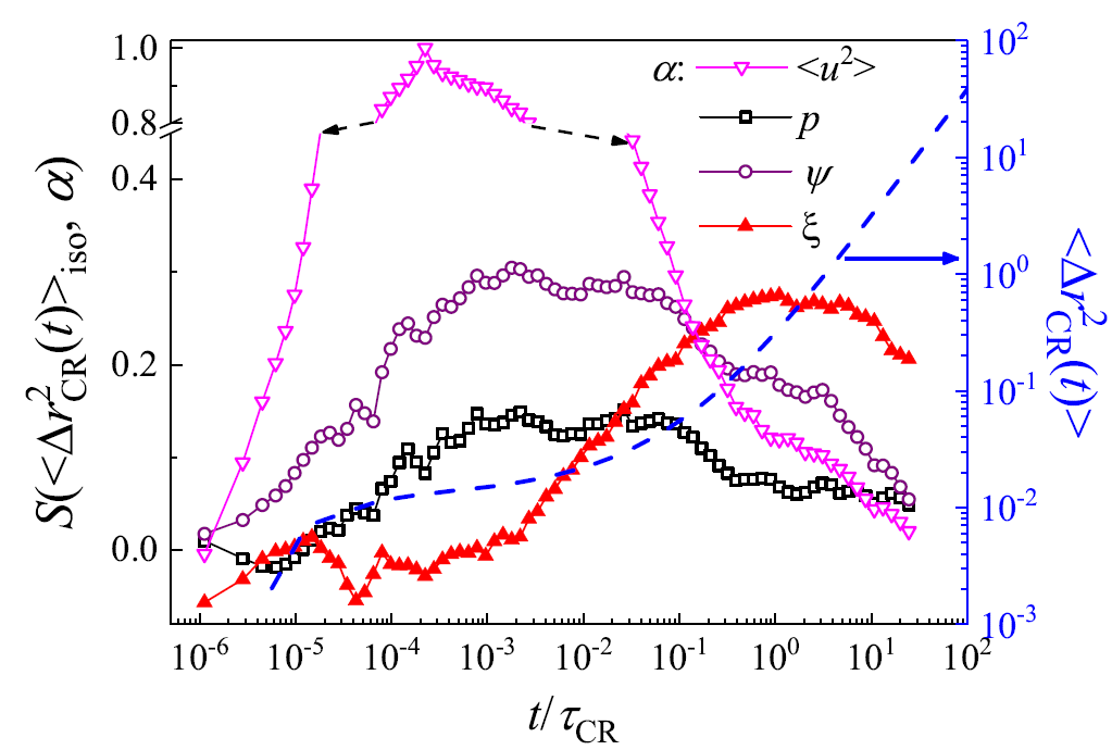 圖3 不同的靜態(tài)量包括Debye-Waller因子< u 2>,其簡(jiǎn)諧近似下的均方位移ψ,低頻振動(dòng)模的參與分?jǐn)?shù)p,以及塑性長(zhǎng)度ξ與動(dòng)態(tài)量<<?r2CR(t)>>的Spearman等級(jí)相關(guān)系數(shù)S。