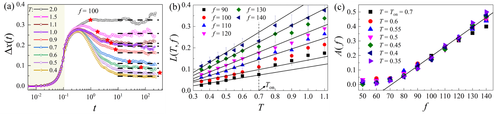 圖1 (a) 對(duì)粒子施加一外力,其大小f = 100時(shí) (陰影區(qū)時(shí)間間隔內(nèi)),粒子平均位移隨時(shí)間的變化,黑色虛線表示較長(zhǎng)時(shí)間下平均位移趨近一平臺(tái)值,即不可逆位移L(T, f)。(b) 不同外力大小時(shí),不可逆位移L(T, f)隨溫度的依賴規(guī)律。