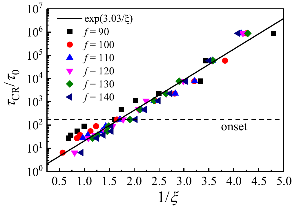 團(tuán)隊(duì)設(shè)計(jì)了新的探測(cè)玻璃體系靜態(tài)結(jié)構(gòu)的手段,具體為,在短時(shí)間內(nèi),對(duì)粒子施加一固定大小,方向隨機(jī)選取的力,觀察撤去力之后,粒子不能回彈的位移,即不可逆位移有多大。圖1(a)展示了當(dāng)對(duì)粒子在0.1(約化單位)時(shí)間間隔內(nèi)施加一外力大小為f = 100(約化單位)的力時(shí),粒子平均位移隨時(shí)間的演化規(guī)律。較長(zhǎng)時(shí)間下,此平均位移趨近一平臺(tái)值,即黑色虛線標(biāo)出的不可逆位移L(T, f),顯然,溫度越低,不可逆位移L(T, f)越小。近一步的研究發(fā)現(xiàn),L(T, f)正比于 T - T 0 (圖1 (b)),其中 T 0為Vogel–Fulcher–Tammann (VFT) 方程預(yù)測(cè)的非晶體系的理想玻璃化轉(zhuǎn)變點(diǎn),因此,L(T, f)在理想玻璃化轉(zhuǎn)變點(diǎn)外推為0。進(jìn)一步分離變量,我們可得到L(T, f) = ξ(T)A(f), 其中塑性長(zhǎng)度ξ(T)∝( T - T 0 ), A(f) ∝( f - f 0)。塑性長(zhǎng)度ξ(T)與體系弛豫時(shí)間存在指數(shù)依賴關(guān)系(圖2),因此建立了塑性長(zhǎng)度與非晶體系慢動(dòng)力學(xué)的聯(lián)系。
