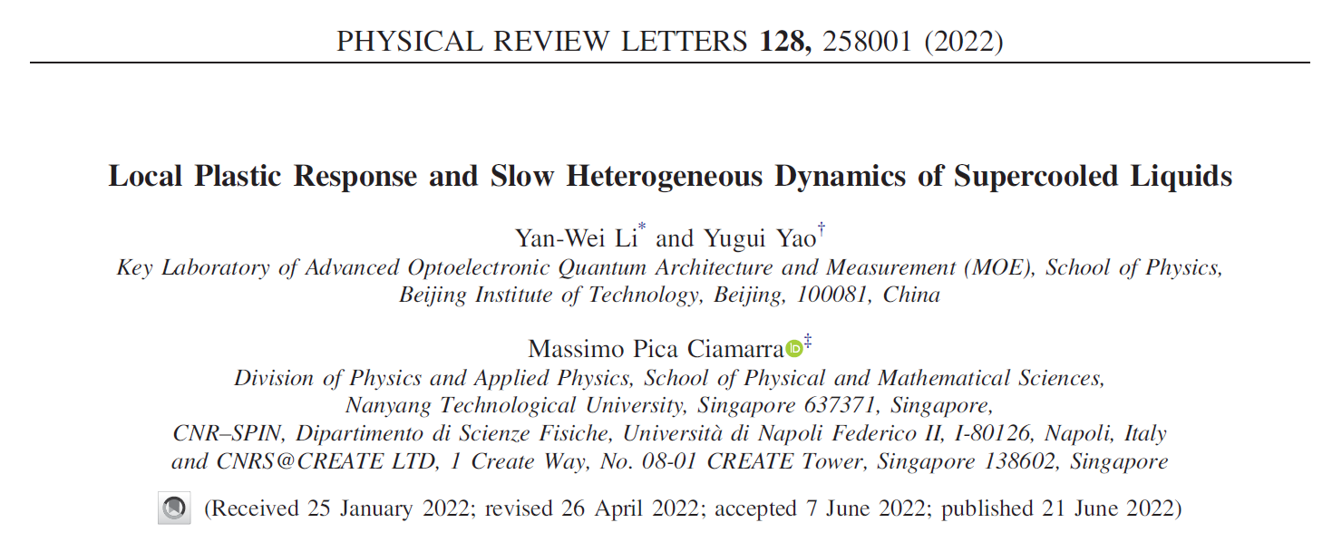 相關(guān)工作發(fā)表在Physical Review Letters上,北京理工大學(xué)物理學(xué)院李艷偉研究員為第一作者兼通訊作者,北京理工大學(xué)物理學(xué)院姚裕貴教授和新加坡南洋理工大學(xué)Massimo Pica Ciamarra為論文共同通訊作者。該工作第一單位為北京理工大學(xué)物理學(xué)院,并得到國(guó)家自然科學(xué)基金、北京理工大學(xué)青年學(xué)者學(xué)術(shù)啟動(dòng)計(jì)劃等項(xiàng)目的支持。