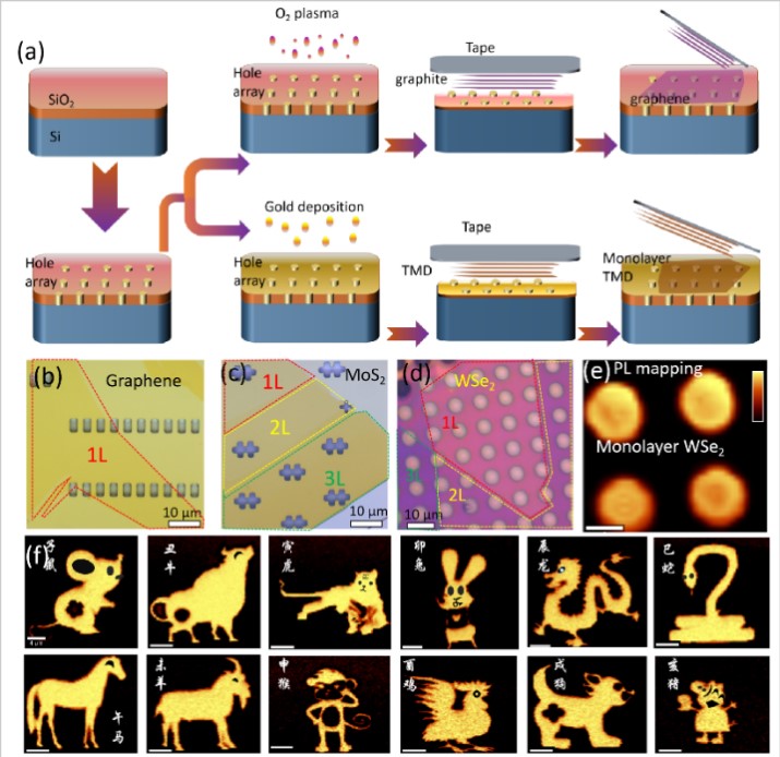 圖1 二維材料懸浮結(jié)構(gòu)的制備路線圖(a)及解理后的二維材料(b-d),解理后的懸浮WSe2展現(xiàn)出良好的熒光特性(e)。(f)是將襯底圖案化(十二生肖圖案)加工后,通過優(yōu)化解理工藝制備的懸浮WSe2熒光成像圖片。