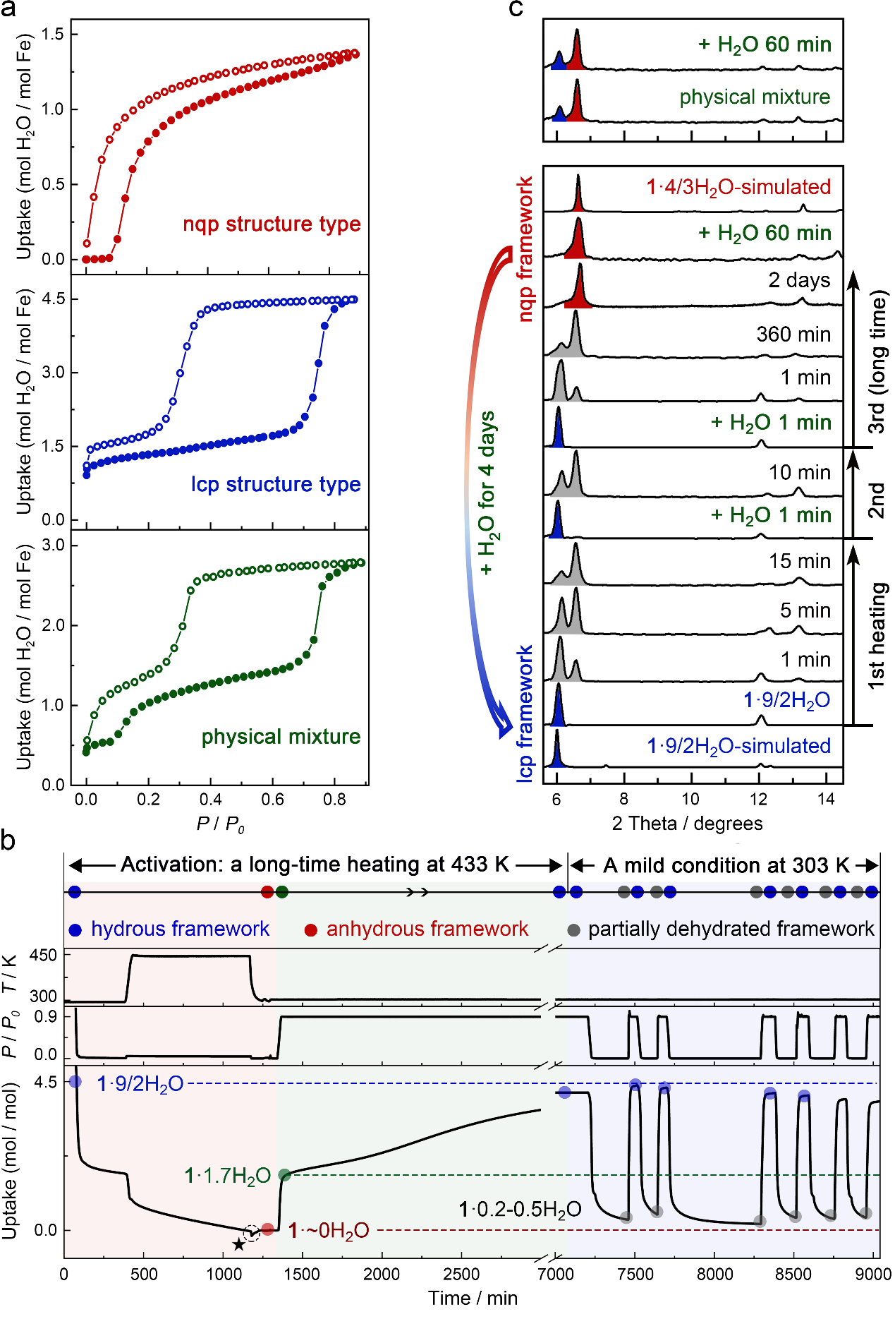圖3 不同活化條件下的吸附等溫線(xiàn)、連續(xù)的水吸脫附循環(huán)和PXRD測(cè)試