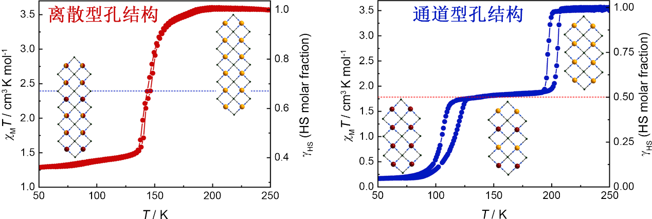 主客體相互作用在實(shí)現(xiàn)材料的可切換結(jié)構(gòu)與功能方面發(fā)揮著重要作用,但合理的設(shè)計(jì)與控制仍具有挑戰(zhàn)。柔性金屬有機(jī)框架材料(Flexible metal-organic frameworks, FMOFs)因其結(jié)構(gòu)的可調(diào)節(jié)性和主客體相互作用的密切關(guān)聯(lián)引起了研究者廣泛的關(guān)注。在結(jié)構(gòu)轉(zhuǎn)變的過(guò)程中,金屬中心的配位構(gòu)型變化有可能導(dǎo)致材料磁學(xué)性質(zhì)的變化。這種磁性多孔材料擴(kuò)寬了多孔材料的應(yīng)用前景,并且為主客體相互作用機(jī)理的理解提供了新的途徑。