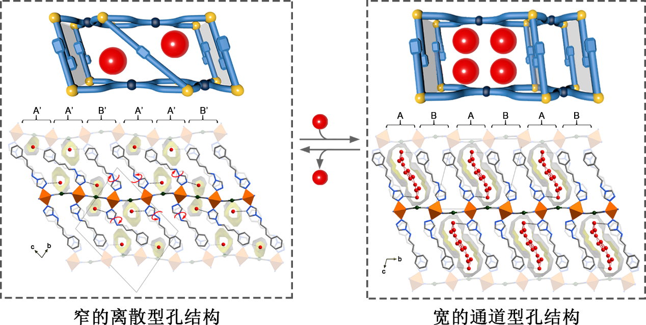 該課題組在前期自旋交叉材料與柔性單晶材料等大量工作的研究基礎(chǔ)上( Inorg. Chem ., 2019, 58, 23, 15705–15709; Inorg. Chem ., 2021, 60, 10, 7337–7344; Nat. Commum. 2019, 10, 4805; Nat. Commum. 2021, 12, 6908.),結(jié)合自旋交叉經(jīng)典Hofmann結(jié)構(gòu)類(lèi)型,通過(guò)引入可以發(fā)生“踏板”運(yùn)動(dòng)的軸向配體,成功合成了一例具有特殊水吸附響應(yīng)性質(zhì)的柔性自旋交叉多孔材料。在吸附水的過(guò)程中,孔道結(jié)構(gòu)可以從窄孔相轉(zhuǎn)變?yōu)榇罂紫?,而與其他柔性多孔材料不同的是,吸附過(guò)程中部分窄孔完全關(guān)閉,而部分孔道完全打開(kāi),即表現(xiàn)出吸附過(guò)程中局部孔道打開(kāi)-關(guān)閉同時(shí)發(fā)生的特殊孔道重構(gòu)行為。這種特殊的孔道結(jié)構(gòu)變化直接反映在材料的吸附性質(zhì):窄孔相結(jié)構(gòu)必須經(jīng)過(guò)長(zhǎng)時(shí)間水氛活化,才能完成孔道的打開(kāi);大孔相也只有經(jīng)過(guò)長(zhǎng)時(shí)間高溫真空處理,才能轉(zhuǎn)變?yōu)橥耆恼紫?;而?dāng)材料同時(shí)具有兩相結(jié)構(gòu)特征時(shí),孔道的打開(kāi)/關(guān)閉可以快速發(fā)生。詳細(xì)的單晶結(jié)構(gòu)分析證實(shí)這一孔道變化是由于軸向配體的非均勻踏板運(yùn)動(dòng)與二維層狀結(jié)構(gòu)的皺折/展開(kāi)導(dǎo)致的。通過(guò)對(duì)比單晶結(jié)構(gòu)的轉(zhuǎn)變,并結(jié)合兩種孔結(jié)構(gòu)不同水合狀態(tài)的能量計(jì)算,作者對(duì)該結(jié)構(gòu)變化的過(guò)程機(jī)理與主客體相互作用進(jìn)行了深入的分析。與此同時(shí),前后結(jié)構(gòu)具有差異性的自旋交叉性質(zhì),即窄孔相結(jié)構(gòu)表現(xiàn)出無(wú)平臺(tái)的兩步自旋交叉性質(zhì),而大孔相結(jié)構(gòu)表現(xiàn)出大平臺(tái)的兩步自旋交叉性質(zhì),體現(xiàn)出兩種結(jié)構(gòu)與主客體相互作用的改變對(duì)自旋交叉性質(zhì)的影響。