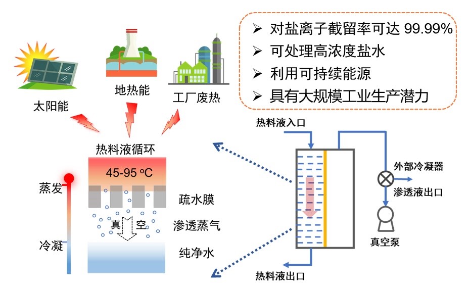 膜蒸餾(MD)技術(shù)利用膜兩側(cè)蒸汽壓力差為傳質(zhì)驅(qū)動(dòng)力并通過(guò)熱驅(qū)動(dòng)使得水蒸氣穿過(guò)多孔的疏水膜材料進(jìn)行脫鹽。膜蒸餾是膜技術(shù)與低溫?fù)]發(fā)技術(shù)相結(jié)合的產(chǎn)物,綜合了反滲透和蒸餾技術(shù)的優(yōu)點(diǎn),可實(shí)現(xiàn)對(duì)溶液中鹽離子接近100%的去除,在處理高濃度、高污染鹽水和利用工業(yè)廢熱等低品位熱以及太陽(yáng)能、地?zé)崮芊矫婢哂芯薮髢?yōu)勢(shì)。此外,MD脫鹽系統(tǒng)相比于傳統(tǒng)熱脫鹽工藝(MED和MSF)設(shè)備簡(jiǎn)單、操作簡(jiǎn)便,具有構(gòu)成大規(guī)模生產(chǎn)體系的靈活性。因此,MD作為一種可持續(xù)的、低能耗的海水淡化技術(shù)在諸多海水淡化工程中具有一定競(jìng)爭(zhēng)力與應(yīng)用前景。然而,傳統(tǒng)聚合物疏水MD膜通量低且面臨嚴(yán)重的膜污染和膜浸潤(rùn)等問(wèn)題,嚴(yán)重限制了膜蒸餾技術(shù)的進(jìn)一步發(fā)展。
