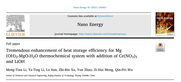近期,北京理工大學化學與化工學院武欽佩教授團隊在儲能科學技術領域取得階段成果。研究成果以“Tremendous enhancement of heat-storage efficiency for Mg(OH)2-MgO-H2O thermochemical system with addition of Ce(NO3)3 and LiOH”為題,12月18日在線發(fā)表于 Nano Energy (https:///doi.org/10.1016/j.nanoen. 2020.105603)。北京理工大學化學與化工學院研究生李夢甜和李亞婷為共同第一作者,北京理工大學是唯一作者單位。
