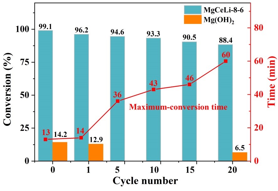 圖2 純Mg(OH)2和MgCeLi-8-6復合材料的最大轉(zhuǎn)化率、最大轉(zhuǎn)化時間和循環(huán)次數(shù)的關系