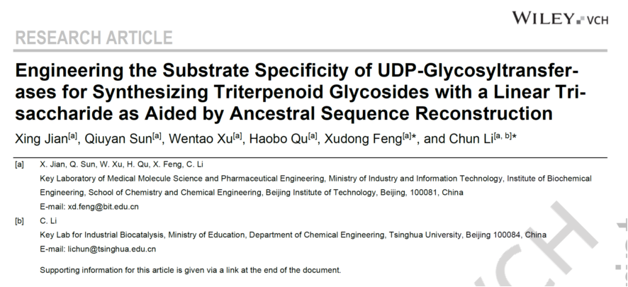 三萜化合物是一類重要的植物天然產(chǎn)物,因其獨(dú)特的藥理活性而受到廣泛關(guān)注。然而,由于分子中的疏水碳環(huán)結(jié)構(gòu),三萜化合物普遍存在溶解度低和生物利用度差的問題。糖基修飾可顯著改善三萜化合物的水溶性,因此三萜化合物多以糖苷的形式存在。其中,直鏈三糖基修飾是一種重要的糖基修飾類型,對(duì)發(fā)揮三萜化合物獨(dú)特的藥理活性具有重要意義。相較于化學(xué)合成法,利用酶法合成三萜糖苷化合物具有反應(yīng)條件溫和、定向催化和環(huán)境友好等優(yōu)勢(shì),特別是在合成具有復(fù)雜多糖基修飾的三萜糖苷化合物時(shí),酶法可避免化學(xué)合成法中繁雜的基團(tuán)保護(hù)與去保護(hù)過程。尿苷二磷酸-糖基轉(zhuǎn)移酶(uridine diphosphate glycosyltransferases,UGTs)是催化天然產(chǎn)物糖基修飾的主要生物催化劑,在目前已報(bào)道的UGTs中,大多僅催化三萜單糖苷和二糖苷的合成,具有直鏈三糖基修飾催化活性的UGTs數(shù)量極少,限制了三萜直鏈三糖苷的酶法合成。此外,該類型UGTs的催化功能特點(diǎn)和底物特異性的分子機(jī)制也不清晰。針對(duì)以上問題,本研究通過生物信息學(xué)分析、結(jié)合體外酶學(xué)性質(zhì)表征系統(tǒng)發(fā)掘可催化合成三萜直鏈三糖苷的UGTs,并揭示該類型UGTs催化底物的結(jié)構(gòu)特點(diǎn),通過祖先酶序列重構(gòu)、氨基酸突變和計(jì)算機(jī)模擬等手段闡明其底物特異性的分子機(jī)制。相關(guān)研究成果以“Engineering the Substrate Specificity of UDP-Glycosyltransferases for Synthesizing Triterpenoid Glycosides with a Linear Trisaccharide as Aided by Ancestral Sequence Reconstruction”為題目在國際知名期刊Angewante Chemie International Edition上發(fā)表(DOI: /10.1002/anie.202409867)。北京理工大學(xué)化學(xué)與化工學(xué)院博士研究生簡(jiǎn)行為該論文的第一作者,清華大學(xué)李春教授與北京理工大學(xué)化學(xué)與化工學(xué)院長(zhǎng)聘副教授馮旭東為該論文的共同通訊作者。