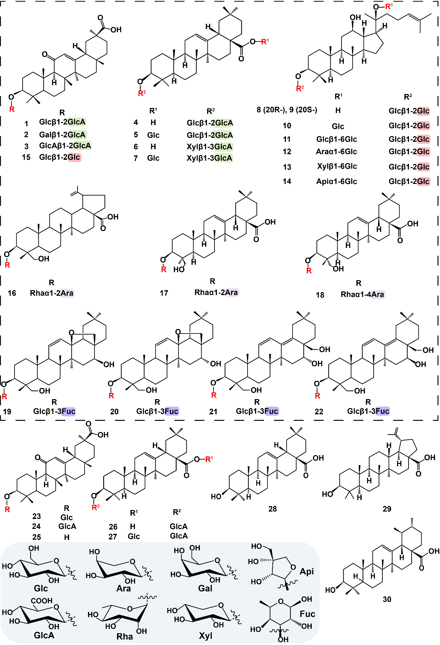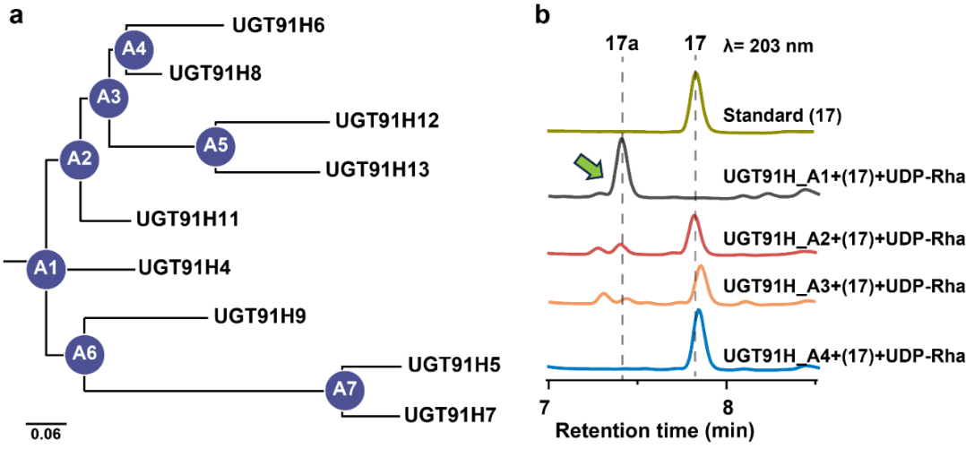 利用祖先酶序列重構(gòu)技術(shù)獲得UGT91H亞家族的祖先酶UGT91H_A1, 其在保留UGT91H亞家族現(xiàn)代酶直鏈三糖基修飾功能外,表現(xiàn)出了更廣的底物譜和更高的活性。在糖基受體方面,UGT91H_A1可催化17個(gè)三萜化合物修飾一分子糖基。在糖基供體方面,除UDP-Rha和 UDP-Xyl之外,UGT91H_A1還具有高效利用UDP-葡萄糖(UDP-Glc)的活性。最后利用UGT91H_A1成功合成了 33個(gè)三萜直鏈三糖苷。