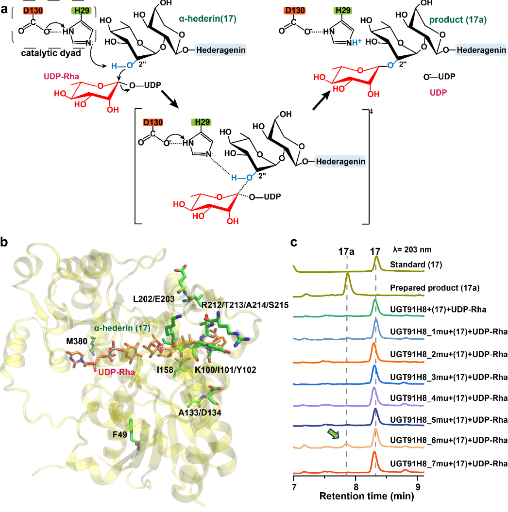 進(jìn)一步闡明了UGT91H_A1中非保守的RTAS Loop對(duì)UGT91H亞家族酶的底物特異性具有重要影響。將RTAS Loop替換至UGT91H8 和UGT91H7對(duì)應(yīng)區(qū)域,分別獲得突變體UGT91H_6mu和UGT91H7M,均具有催化新底物α-常春藤苷(17)糖基修飾的活性。分子動(dòng)力學(xué)模擬和量子力學(xué)計(jì)算表明,RTAS Loop通過影響酶和底物的相互作用和結(jié)合能來調(diào)控酶的底物特異性。
