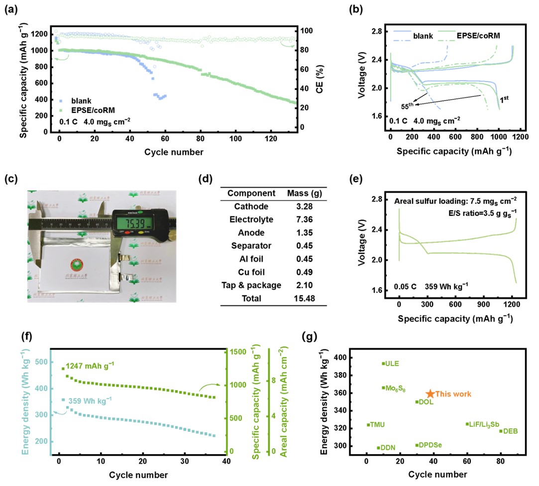 在使用50 μm薄鋰負(fù)極和4.0 mgS cm?2高載量硫正極的條件下,EPSE/coRM體系在保持高放電比容量的前提下將鋰硫紐扣電池的循環(huán)壽命提升至130圈,較之應(yīng)用常規(guī)DOL/DME電解液的鋰硫電池循環(huán)壽命延長(zhǎng)近兩倍。研究人員進(jìn)一步組裝并測(cè)試了設(shè)計(jì)容量為1.5 Ah 的EPSE/coRM鋰硫軟包電池,實(shí)現(xiàn)了359 Wh kg?1的首圈能量密度,并可以穩(wěn)定循環(huán)37圈(能量密度基于所有軟包電池組件計(jì)算得到)。