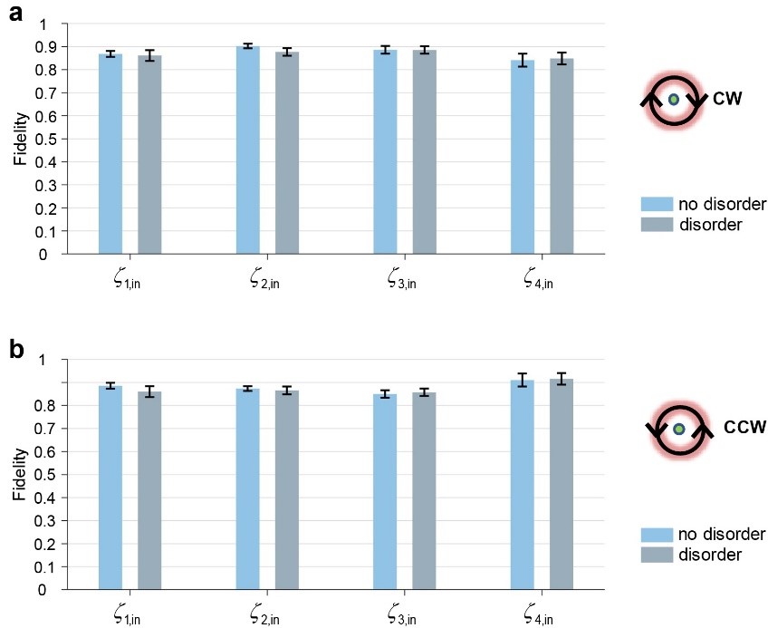 。圖 5 顯示了十組擾動(dòng)的平均結(jié)果。藍(lán)色柱子代表著沒有無(wú)序的情況下,輸出態(tài)與糾纏態(tài)之間的保真度,而灰色柱子代表有無(wú)序擾動(dòng)時(shí)輸出態(tài)的保真度。圖 5a 顯示了順時(shí)針環(huán)繞奇異點(diǎn)的情況。可以看出,對(duì)于四種不同的輸入貝爾態(tài),有擾動(dòng)時(shí)的保真度與沒有擾動(dòng)時(shí)相比變化不大,且都保持在0.8 以上。圖 5b 中逆時(shí)針環(huán)繞奇異點(diǎn)時(shí)也有類似的結(jié)果。這說(shuō)明糾纏態(tài)的手性開關(guān)確實(shí)對(duì)路徑參數(shù)的無(wú)序擾動(dòng)表現(xiàn)出了魯棒性。