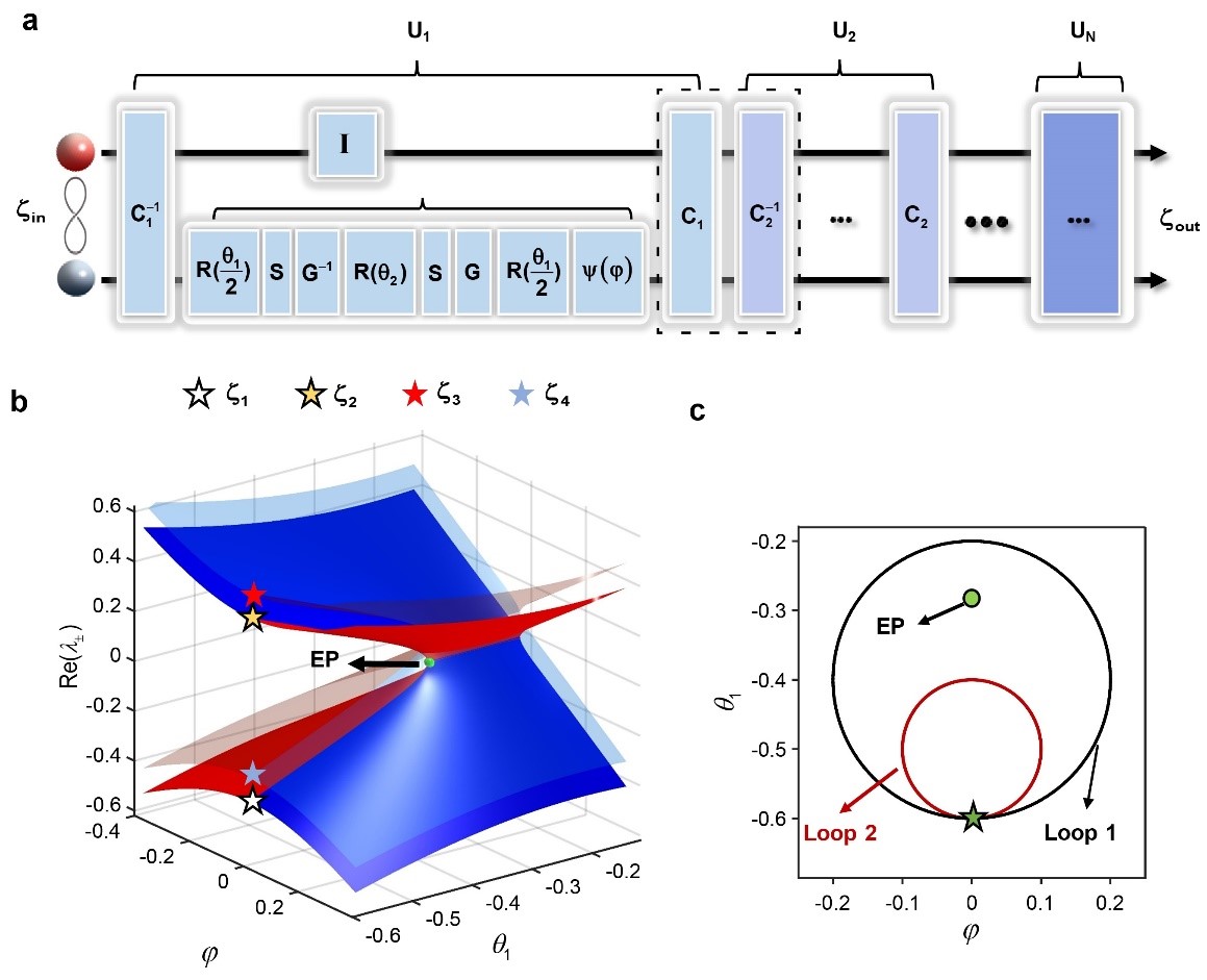圖1. 構(gòu)造非厄米量子行走實(shí)現(xiàn)糾纏態(tài)環(huán)繞奇異點(diǎn)的動(dòng)態(tài)演化