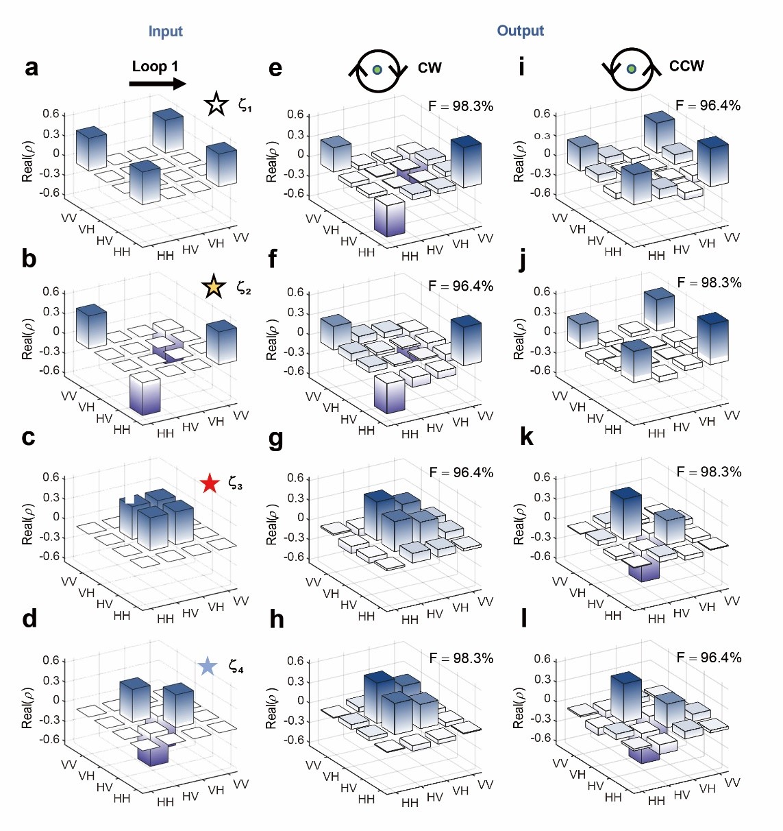 四個(gè)輸出態(tài)的理論密度矩陣如圖 2 所示。圖 2e-2h 對(duì)應(yīng)的是順時(shí)針變化的情況,而圖 2i-2l 對(duì)應(yīng)的是逆時(shí)針變化的情況。為便于比較,圖 2a-2d 顯示了輸入狀態(tài)的密度矩陣。圖 2a-2d 中的白色、黃色、紅色和藍(lán)色星號(hào)與圖 1b 中標(biāo)注的星號(hào)相對(duì)應(yīng),分別代表輸入態(tài)