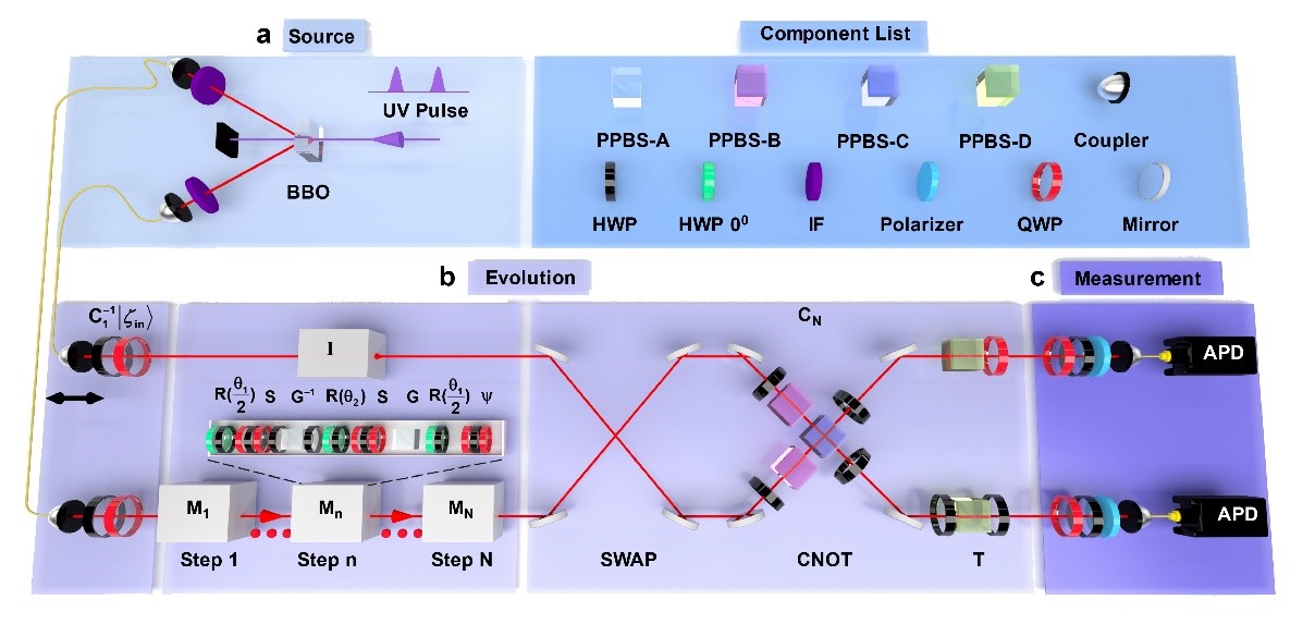 作用于四個(gè)貝爾態(tài)可以得到易于精確制備的輸入態(tài),研究人員便通過(guò)半波片和四分之一波片來(lái)直接實(shí)現(xiàn),然后將它們送入多步演化模塊中。