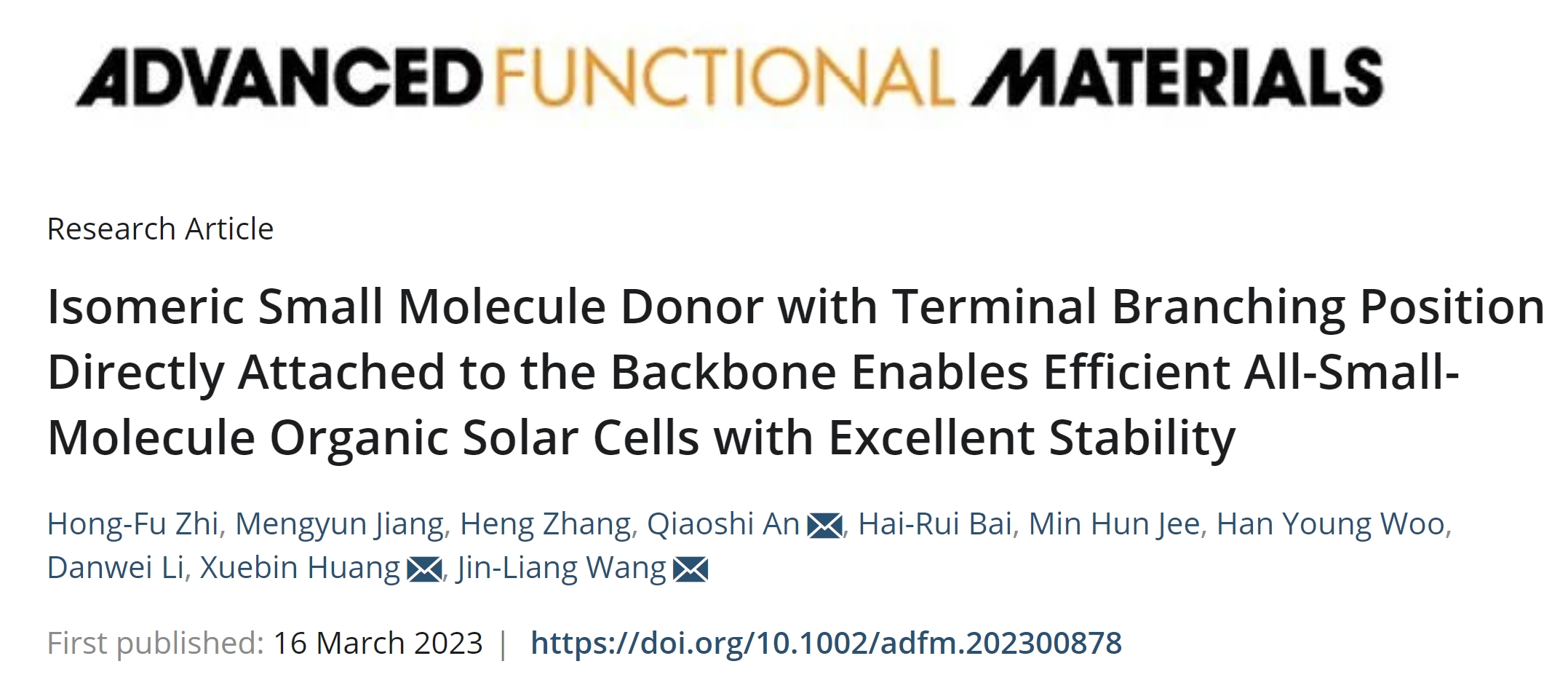 近期,北京理工大學(xué)化學(xué)與化工學(xué)院王金亮教授團隊在異構(gòu)化小分子給體材料合成及其在高效率兼具穩(wěn)定性好的全小分子有機太陽能電池的應(yīng)用研究方面取得重要進展,相關(guān)研究成果發(fā)表在材料類國際頂級期刊《Advanced Functional Materials》(DOI: 10.1002/adfm.202300878)上,題為“Isomeric Small Molecule Donor with Terminal Branching Position Directly Attached to the Backbone Enables Efficient All-Small-Molecule Organic Solar Cells with Excellent Stability”。北京理工大學(xué)為唯一通訊單位,化學(xué)與化工學(xué)院王金亮教授、安橋石特別研究員、黃學(xué)斌副教授為共同通訊作者,碩士研究生支鴻富為第一作者。