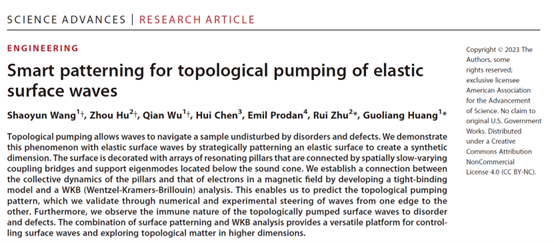 近日,北京理工大學(xué)大學(xué)宇航學(xué)院朱睿教授聯(lián)合美國(guó)密蘇里大學(xué)黃國(guó)良教授在彈性表面波拓?fù)漭斶\(yùn)研究方面取得新進(jìn)展。相關(guān)成果以“Smart patterning for topological pumping of elastic surface waves”為題,在Science Advances上發(fā)表[Sci adv (2023) 9, eadh4310]。北京理工大學(xué)宇航學(xué)院朱睿教授和美國(guó)密蘇里大學(xué)黃國(guó)良教授為論文的共同通訊作者。北京理工大學(xué)宇航學(xué)院博士研究生胡洲為論文的共同第一作者,完成了論文的樣品制備和實(shí)驗(yàn)測(cè)試部分。該研究工作得到了國(guó)家自然科學(xué)基金委的資助。