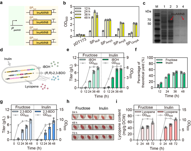 此外,在3L發(fā)酵罐中,成功提高了L23R7菌株利用菊粉進(jìn)行非滅菌發(fā)酵生產(chǎn)異丁醇的產(chǎn)量,達(dá)到41.0±1.2 g/L,為搖瓶發(fā)酵實驗的5.5倍。該產(chǎn)率為0.19g/g菊粉,達(dá)到最大理論產(chǎn)率的45.5%。證明了工程改造菌株L23R7具有工業(yè)化生產(chǎn)異丁醇的極大潛力(圖4)。