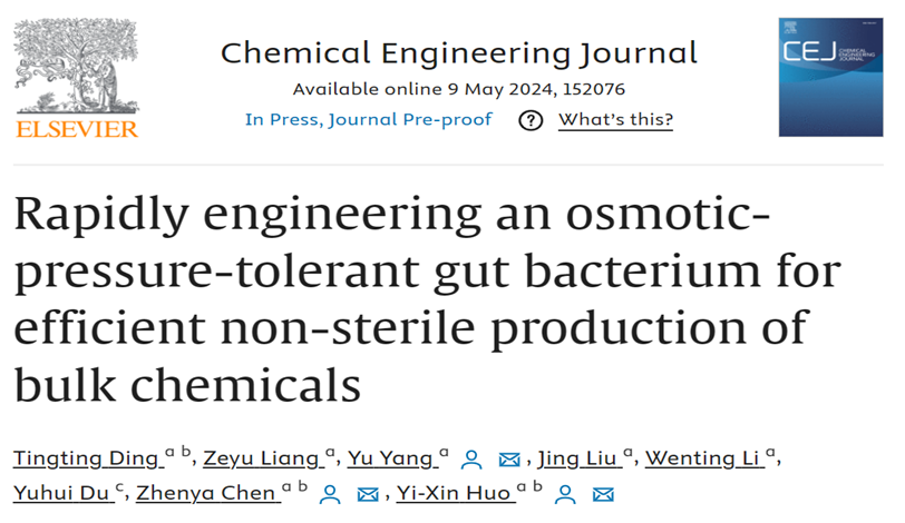 近日,北京理工大學(xué)霍毅欣教授團(tuán)隊在改造耐鹽濟(jì)州桿菌實現(xiàn)非滅菌發(fā)酵生產(chǎn)方面取得重要進(jìn)展。相關(guān)研究成果以“Rapidly engineering an osmotic-pressure-tolerant gut bacterium for efficient non-sterile production of bulk chemicals”為題,在頂級期刊《Chemical Engineering Journal》(影響因子:15.1)上發(fā)表(doi.org/10.1016/j.cej.2024.152076)。