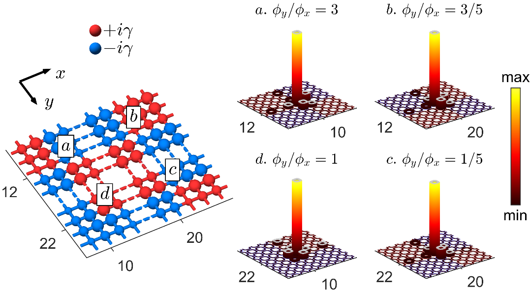 為了給出更加普適的研究方法,研究團(tuán)隊(duì)研究了AAH模型、SSH模型、谷光子晶體和C6v類(lèi)型的光子晶體等多種常見(jiàn)的非厄米拓?fù)涔庾訉W(xué)體系,提出了一種通過(guò)引入不同疇拓?fù)鋺B(tài)之間耦合系數(shù)來(lái)構(gòu)建體系有效哈密頓量的新方法,為研究新型增益-損耗疇壁拓?fù)涔鈱W(xué)體系提供了較為普適的研究方案。在由緊束縛哈密頓量H_1D描述的一維AAH構(gòu)型中,使用擬合的方法確定有效哈密頓量H_eff的相關(guān)參數(shù),理論計(jì)算發(fā)現(xiàn)有效哈密頓量H_eff可以準(zhǔn)確的描述相應(yīng)拓?fù)鋺B(tài)的模式分布與模式頻率(圖1)。同時(shí),研究團(tuán)隊(duì)將該方法推廣至高維,通過(guò)在二維AAH構(gòu)型中構(gòu)造十字形的增益-損耗界面,還實(shí)現(xiàn)了由增益-損耗疇壁誘導(dǎo)的拓?fù)浣菓B(tài),并成功構(gòu)建出有效哈密頓量分析相應(yīng)現(xiàn)象,通過(guò)適當(dāng)調(diào)整體系參數(shù)與體系內(nèi)的增益損耗分布,可以在二維體系內(nèi)的不同位置誘導(dǎo)出拓?fù)浣菓B(tài)(圖2)。這一工作揭示了由增益-損耗疇壁誘導(dǎo)的拓?fù)鋺B(tài)的產(chǎn)生機(jī)制,同時(shí)對(duì)有源調(diào)控拓?fù)鋺B(tài)具有指導(dǎo)意義。
