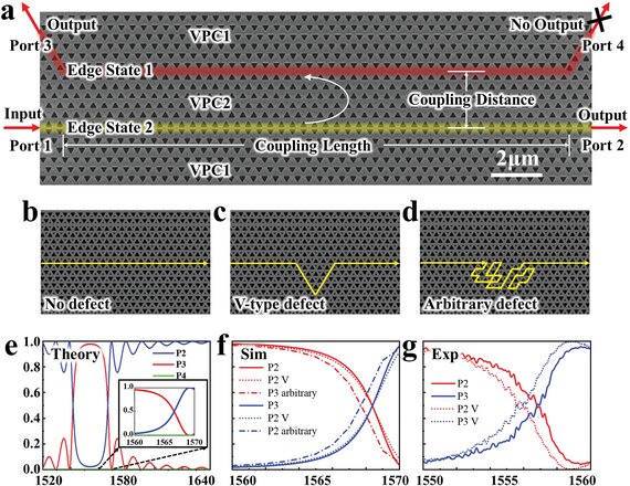 另外,通過繪制超胞的能帶圖(圖1d),可以清楚地看到,在拓撲能隙中出現(xiàn)了兩個邊緣態(tài),它們在K谷具有相反的正負群速度。由于有限尺寸效應,兩個邊緣態(tài)之間出現(xiàn)了打開的能隙,這表明它們之間發(fā)生了耦合。并且兩個邊緣態(tài)模式具有不同的傳播方向,如圖1e所示。利用拓撲邊緣態(tài)的獨特特性,研究人員設(shè)計了拓撲反向耦合器(topo-CDC)。這里,topo-CDC由三層拓撲谷光子晶體結(jié)構(gòu)組成。圖2展示了topo-CDC的SEM圖像和理論實驗透射率結(jié)構(gòu)。由于topo-CDC的鏡像對稱性,在端口1和4入射時,端口2和3可以出射任意比例的光。這表明利用topo-CDC可以實現(xiàn)任意分束比的2×2光束分束。