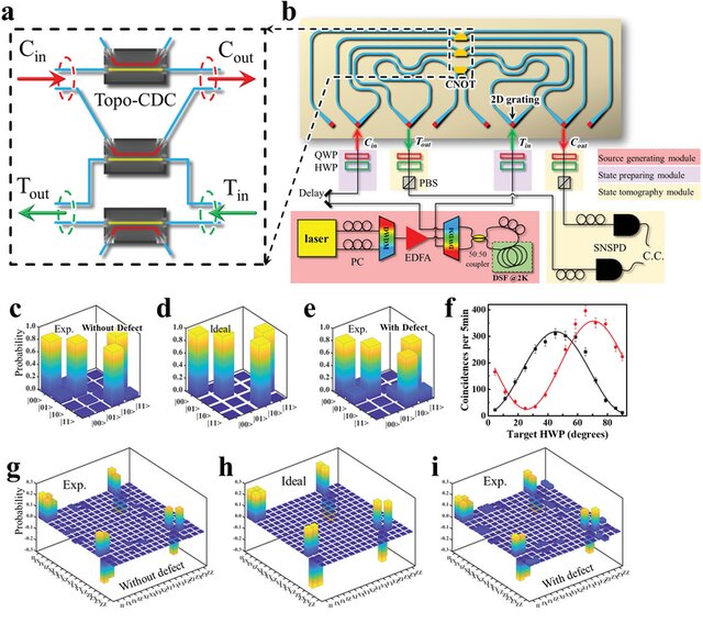 )。編碼光子通過二維光柵注入到芯片中,二維光柵可以將自由空間中的偏振編碼光子轉(zhuǎn)換為芯片內(nèi)的路徑編碼光子態(tài)。通過在topo-CDC中發(fā)生的兩光子干涉實現(xiàn)CNOT功能。在這種情況下,輸出量子比特可以通過包含HWP,QWP,偏振分束器(PBS)和光纖耦合的超導納米線單光子探測器(SNSPD)的態(tài)層析模塊進行測量。