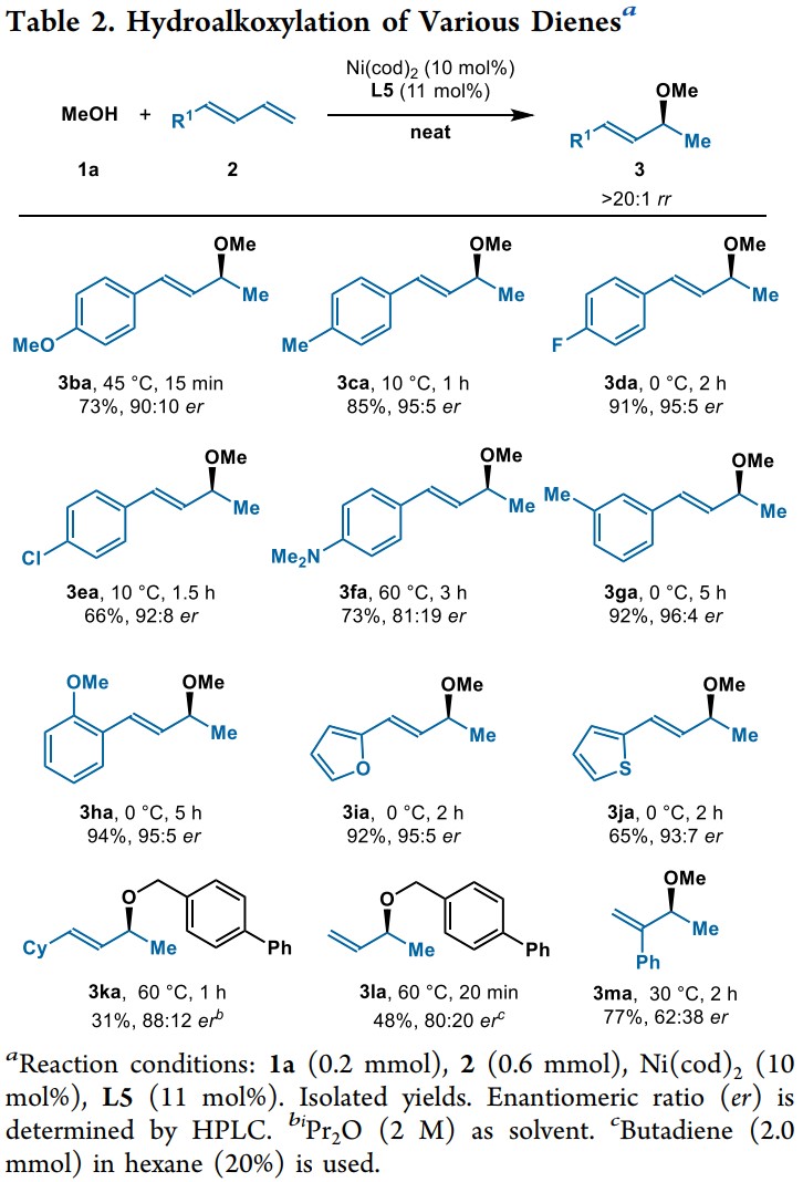 圖2. 不同類型1,3-二烯的氫烷氧化反應(yīng)