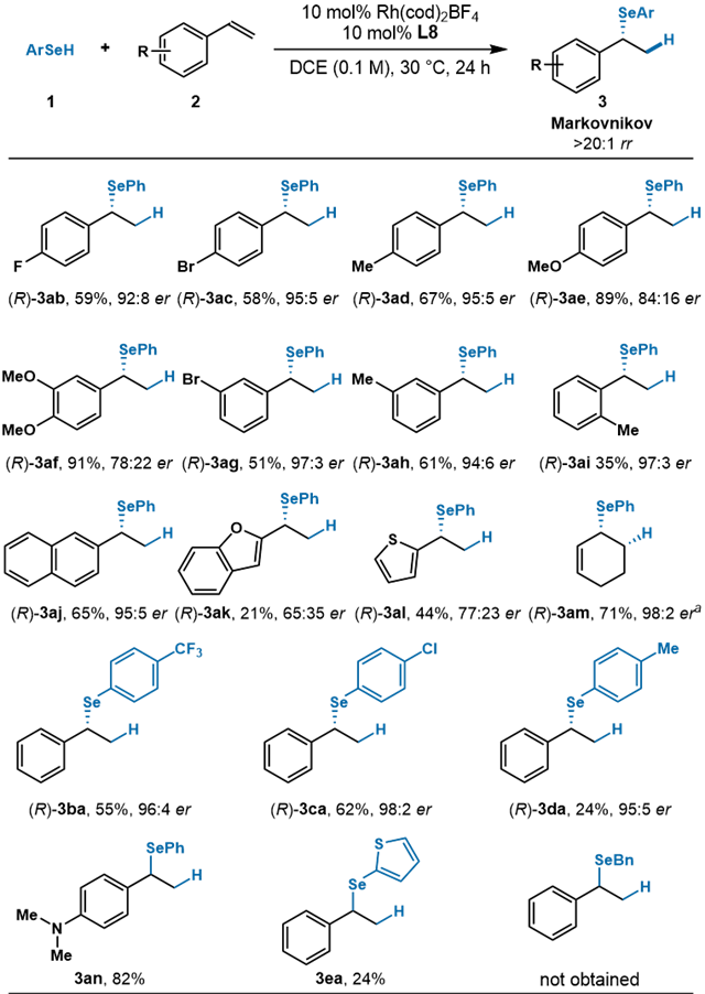 不同類型的烯烴可以給出很好的反應結果(圖2)。例如:苯環(huán)上含有甲基、甲氧基和鹵素取代的苯乙烯和萘乙烯都適用于該反應。此外,環(huán)己二烯的氫硒化反應性和對映選擇性也很好。對于硒醇底物,苯環(huán)上含有三氟甲基、氯和甲基取代基的苯硒醇都具有較高的對映選擇性,與具有給電子基團的硒醇相比,苯環(huán)上具有吸電子基團的硒醇表現(xiàn)出更高的反應性。