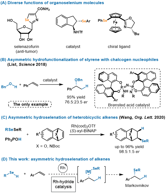 自1818年Berzelius發(fā)現(xiàn)硒以來,硒已被引入藥物、催化劑和材料的設計中(圖1A)。盡管硒是人類健康的基本元素,但與氧簇元素中的氧和硫相比,硒的反應研究仍然少得多,并且存在很多挑戰(zhàn)。此外,烯烴的氫官能化反應可以從廉價易得的烯烴構建各種分子砌塊,盡管是一種非常具有原子經(jīng)濟性的策略,但氧簇元素作為氫官能化中親核試劑的研究很少。近日,楊小會教授課題組和Vy M. Dong教授課題組合作首次實現(xiàn)了Rh催化苯乙烯的不對稱氫硒化反應(圖1D)。