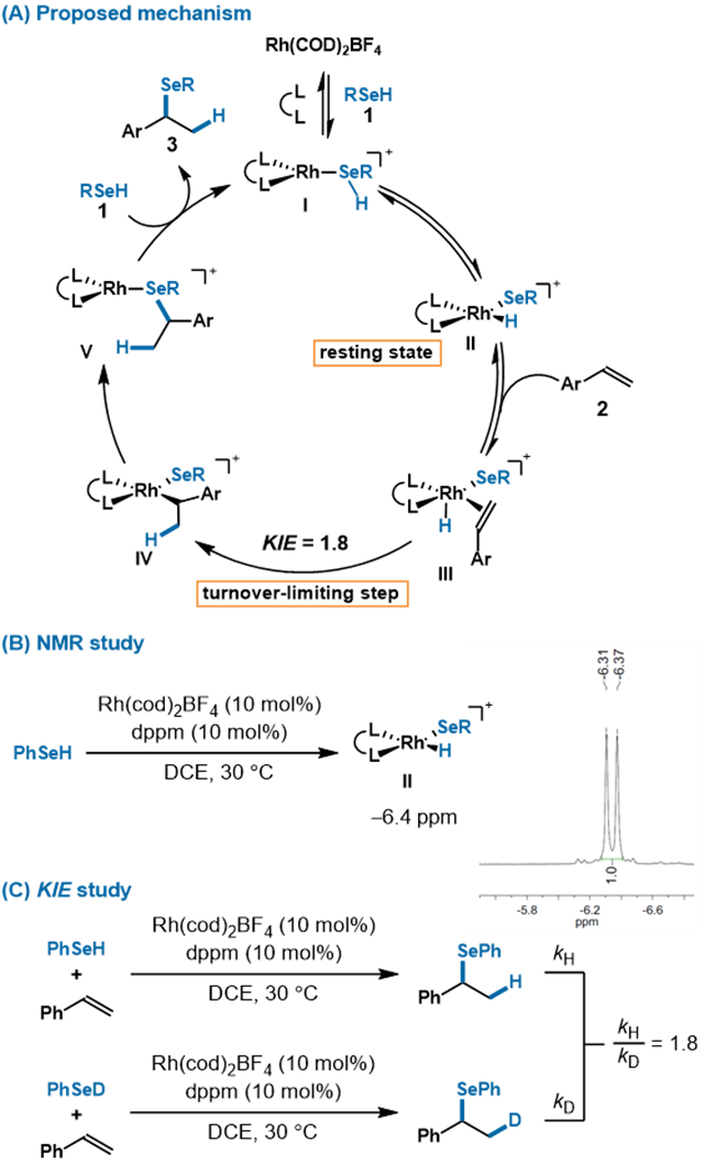 在一系列機理實驗例如核磁實驗、氘代實驗等研究的基礎之上,證實了氫硒化反應機理的決速步驟是烯烴遷移插入Rh-H鍵(圖3)。