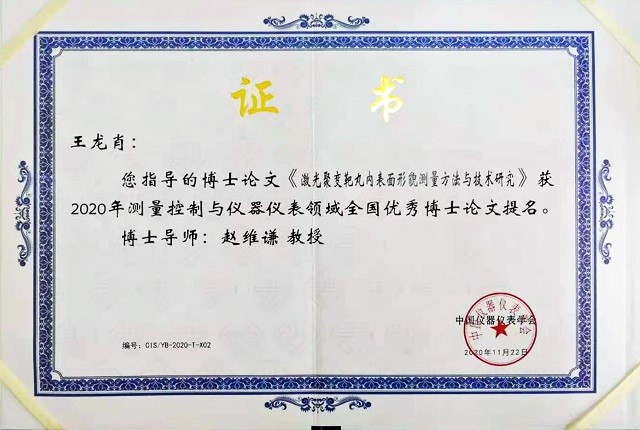 12月24日,中國儀器儀表學會2020年科技獎勵大會暨九屆三次理事(擴大)會議在浙江省杭州市召開,本次大會上頒發(fā)了2020年全國儀器科學與技術學科優(yōu)秀博士論文獎及提名獎。今年共評選出優(yōu)秀博士論文5篇,優(yōu)秀博士論文提名5篇。北京理工大學光電學院博士畢業(yè)生程陽獲優(yōu)秀博士論文獎,王龍肖獲優(yōu)秀博士論文提名獎。