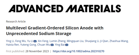 北京理工大學(xué)材料學(xué)院白瑩教授研究小組在鈉離子電池負(fù)極材料研究中取得重要進(jìn)展,11月28日,相關(guān)研究成果以“Multilevel Gradient-Ordered Silicon Anode with Unprecedented Sodium Storage”為題在國際知名期刊 Advanced Materials 上發(fā)表。北京理工大學(xué)材料學(xué)院白瑩教授、吳川教授和李雨副研究員為本論文共同通訊作者,材料學(xué)院博士后李瑩為第一作者。