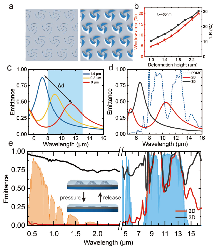 納米剪紙熱輻射器件還可以動(dòng)態(tài)控制熱輻射的波長(zhǎng)范圍和可見光的透射/吸收,從而實(shí)現(xiàn)高效的熱管理。為了證明這種能力,研究團(tuán)隊(duì)設(shè)計(jì)了一種聚合物嵌合的具有風(fēng)車形狀的納米剪紙熱管理器件(圖3)。風(fēng)車結(jié)構(gòu)可以在應(yīng)力引導(dǎo)下實(shí)現(xiàn)大的扭轉(zhuǎn)變形。一方面,在可見波段,它可以像窗口一樣動(dòng)態(tài)反射或接收太陽(yáng)能。隨著變形高度的增加,納米窗口打開,窗口面積繼續(xù)增加,導(dǎo)致可見光透射和吸收增加。通過在底部設(shè)計(jì)摻雜的硅或其他吸收材料,該裝置可以有效地控制太陽(yáng)能的吸收。另一方面,在紅外波段,風(fēng)車結(jié)構(gòu)可以調(diào)節(jié)熱輻射的峰值波長(zhǎng)。圖3中顯示了具有不同變形高度的風(fēng)車結(jié)構(gòu)的熱發(fā)射光譜。當(dāng)二維狀態(tài)下可以使納米結(jié)構(gòu)的發(fā)射峰位于大氣窗口的波長(zhǎng)范圍內(nèi),而三維狀態(tài)下使發(fā)射波長(zhǎng)在大氣窗口之外,這種動(dòng)態(tài)的調(diào)控是通過將剪紙結(jié)構(gòu)內(nèi)嵌進(jìn)彈性聚合物中實(shí)現(xiàn)的。