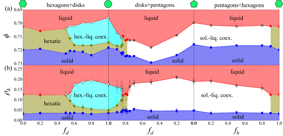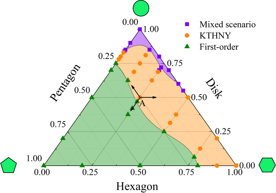 圍繞以上科學(xué)問題,團隊設(shè)計了同一尺寸的圓形,正六邊形,正五邊形的二組分及三組分混合體系,基于分子動力學(xué)模擬研究了不同配比下體系的相行為及缺陷演化。由于尺寸的均一性,不同形狀粒子的混合是均勻的(圖1),沒有出現(xiàn)相分離或玻璃化轉(zhuǎn)變的過程。
