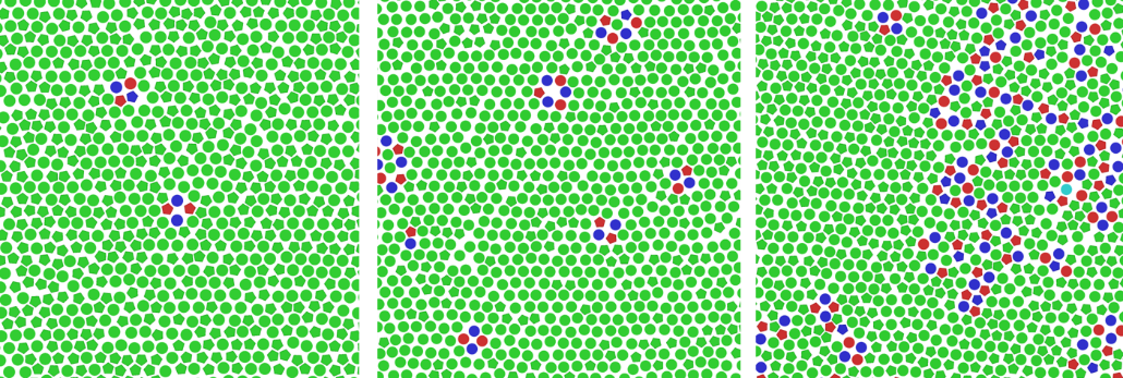 圖1. 圓形-正五邊形二組分混合體系中固相(左),六角相(中),固-液共存相(右)中的缺陷(紅色和藍色)分布。紅色、綠色、藍色分別代表粒子有5、6、7個近鄰。