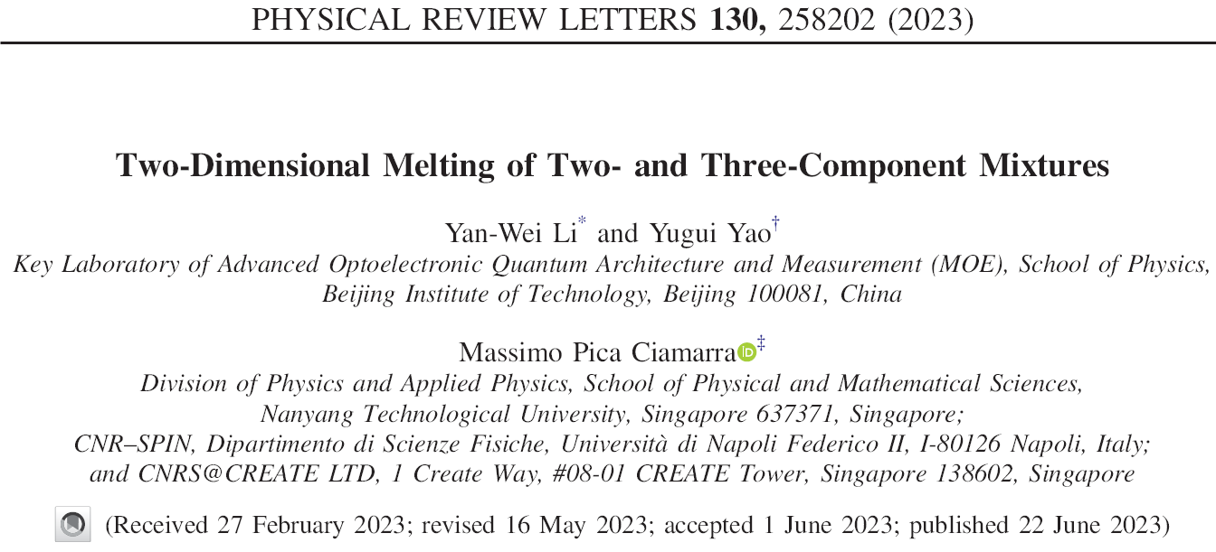 相關(guān)工作發(fā)表在Physical Review Letters上,北京理工大學(xué)物理學(xué)院李艷偉研究員為第一作者兼通訊作者,北京理工大學(xué)物理學(xué)院姚裕貴教授和新加坡南洋理工大學(xué)Massimo Pica Ciamarra為論文共同通訊作者。該工作第一單位為北京理工大學(xué)物理學(xué)院,并得到國家自然科學(xué)基金、北京理工大學(xué)青年學(xué)者學(xué)術(shù)啟動計劃等項目的支持。