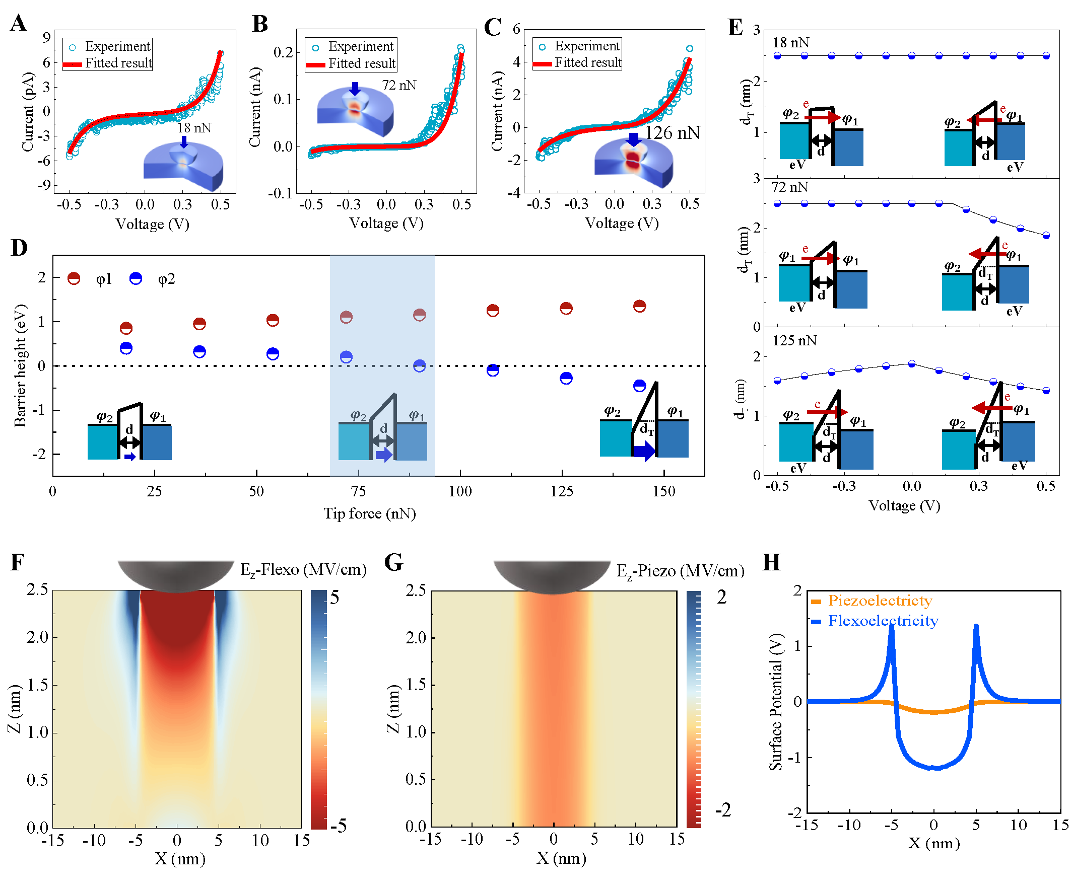 圖3. 針尖力增強CIPS電流整流效應(yīng)的定量分析。(A至C) 不同針尖力下典型的I-V曲線及使用梯形和三角形隧穿勢壘模型進(jìn)行擬合的結(jié)果。(D) 不同針尖力下上下界面隧穿勢壘的變化。插圖為隧穿勢壘的示意圖。φ1和φ2分別表示Pt/Ir針尖-樣品界面和樣品-Au襯底界面的隧穿勢壘。(E) 針尖力為18、72和125 nN時隧穿厚度 d T的變化。插圖為勢壘變化的示意圖。(F和G) 分別為針尖力為144 nN時計算得到的壓電場和撓曲電場(Ez-piezo和Ez-flexo)。(H) 根據(jù)壓電/撓曲電場計算得到的針尖-樣品接觸處的表面電勢。