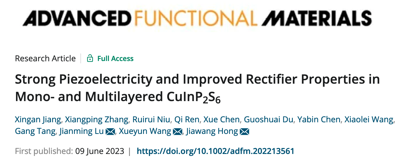 近日,北京理工大學(xué)宇航學(xué)院洪家旺教授、王學(xué)云副教授團(tuán)隊報道了單原子層厚度的二維范德瓦爾斯CuInP2S6鐵電材料面外強壓電性效應(yīng)以及增強的電流自整流特性,相關(guān)成果以“Strong Piezoelectricity and Improved Rectifier Properties in Mono- and Multilayered CuInP2S6”為題,發(fā)表于國際頂級學(xué)術(shù)期刊《Advanced Functional Materials》。