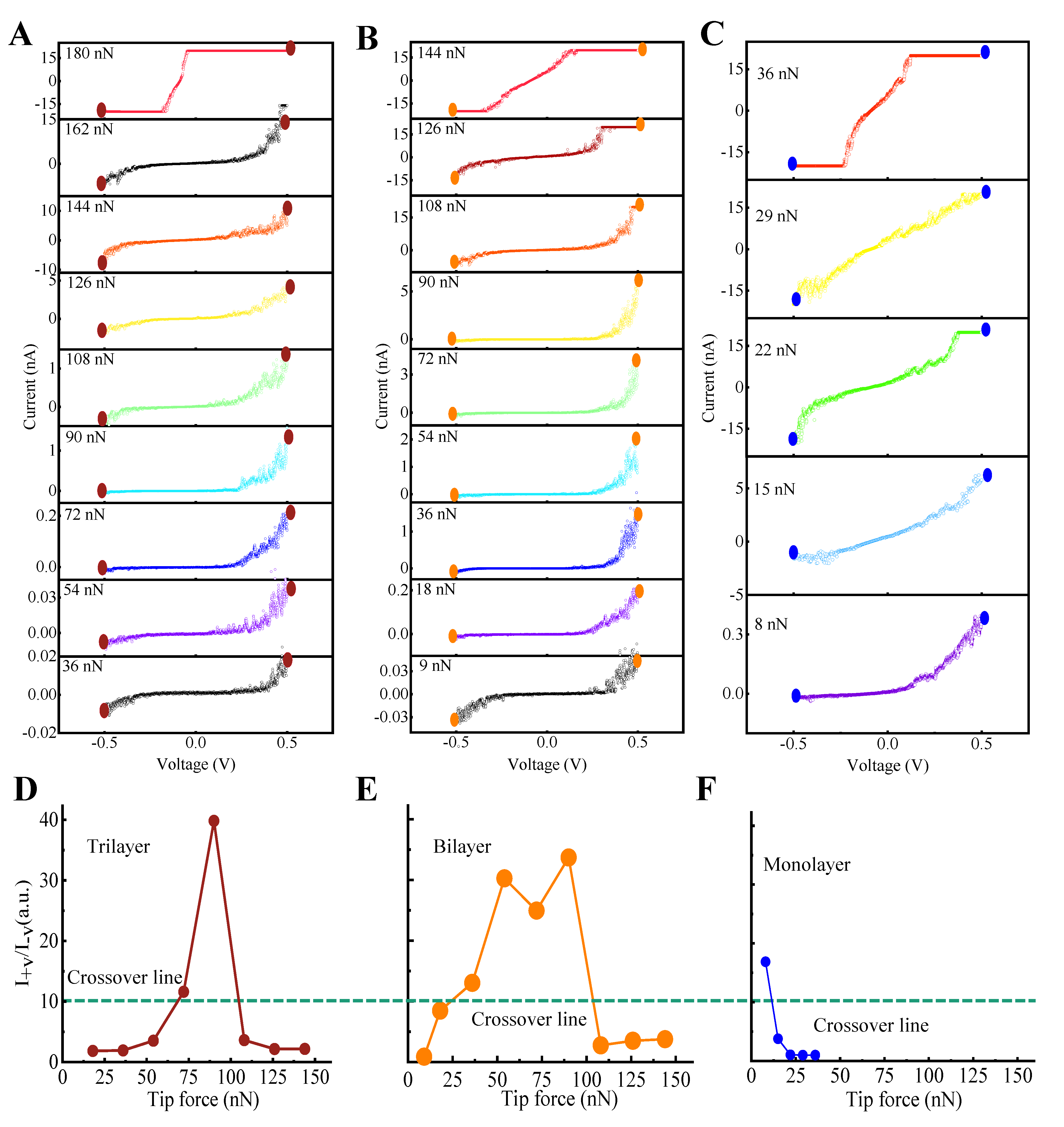 圖2. 針尖力調(diào)制三層、雙層和單層CIPS垂直結(jié)的電流整流效應(yīng)。(A至C) 分別為三層、雙層和單層CIPS在逐漸增大的針尖力下的電流-電壓(I-V)曲線。正負(fù)電壓端的電流比值用于描述電流整流比。(D至F) 分別為隨著針尖力增加,三層、雙層和單層CIPS的電流整流比結(jié)果。