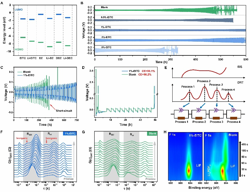 研究通過理論計(jì)算和成分分析(XPS)確定了EITC在鋰金屬表面的自聚合行為,并通過Li||Li對(duì)稱電池和Li||Cu半電池測(cè)試和驗(yàn)證了EITC對(duì)鋰金屬負(fù)極電化學(xué)性能的改善作用。不同電解液體系中鋰金屬負(fù)極的弛豫時(shí)間分布(DRT)分析和XPS分析發(fā)現(xiàn),在EITC調(diào)控下的鋰金屬表面形成了富含LiF的SEI,而無添加劑組的SEI中存在大量LixPOFy中間產(chǎn)物。