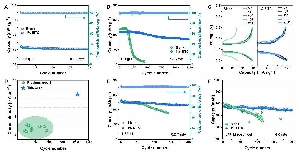 含有1%-EITC的LTO|Li電池在10 C下循環(huán)1000次后,仍能保持81.4%的容量。此外,1 Ah LFP|Li軟包電池,在6 C下同樣具有穩(wěn)定的循環(huán)性能,在200次的循環(huán)中實(shí)現(xiàn)了95%的容量保持率。該研究通過電解液添加劑的方式調(diào)控界面化學(xué),在“非高濃“條件下成功得到富含LiF的SEI,為電解液調(diào)控金屬鋰界面化學(xué)的設(shè)計(jì)提供了一些新思路。