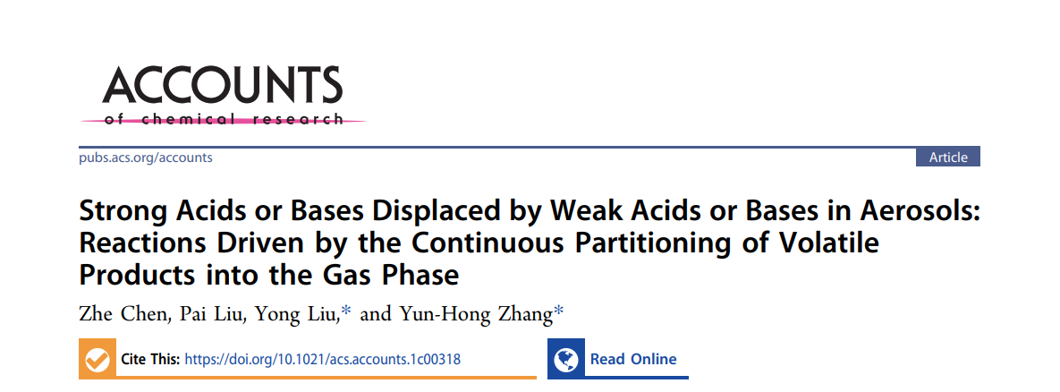 近日,Accounts of Chemical Research(《化學(xué)研究評(píng)述》)以“Strong Acids or Bases Displaced by Weak Acids or Bases in Aerosols: Reactions Driven by the Continuous Partitioning of Volatile Products into the Gas Phase”為題,在線發(fā)表了北京理工大學(xué)化學(xué)與化工學(xué)院張韞宏團(tuán)隊(duì)的綜述文章,討論了氣溶膠體系中弱酸(弱堿)置換強(qiáng)酸(強(qiáng)堿)的獨(dú)特現(xiàn)象。