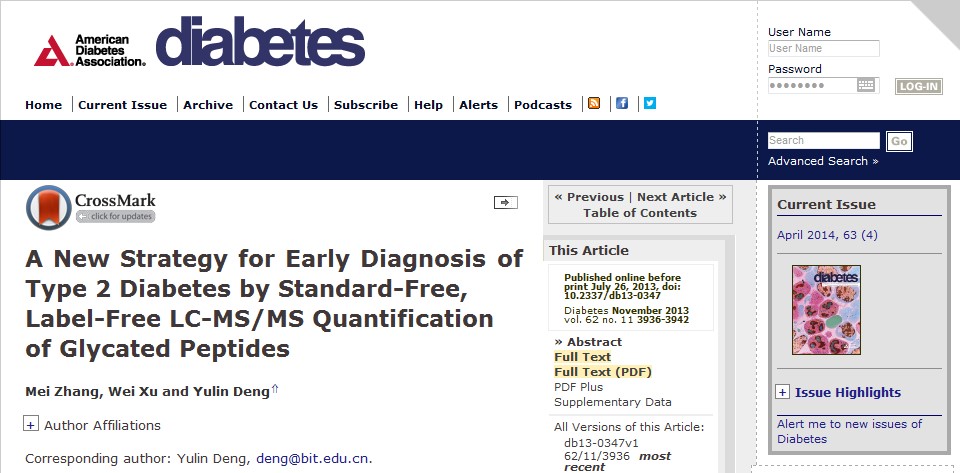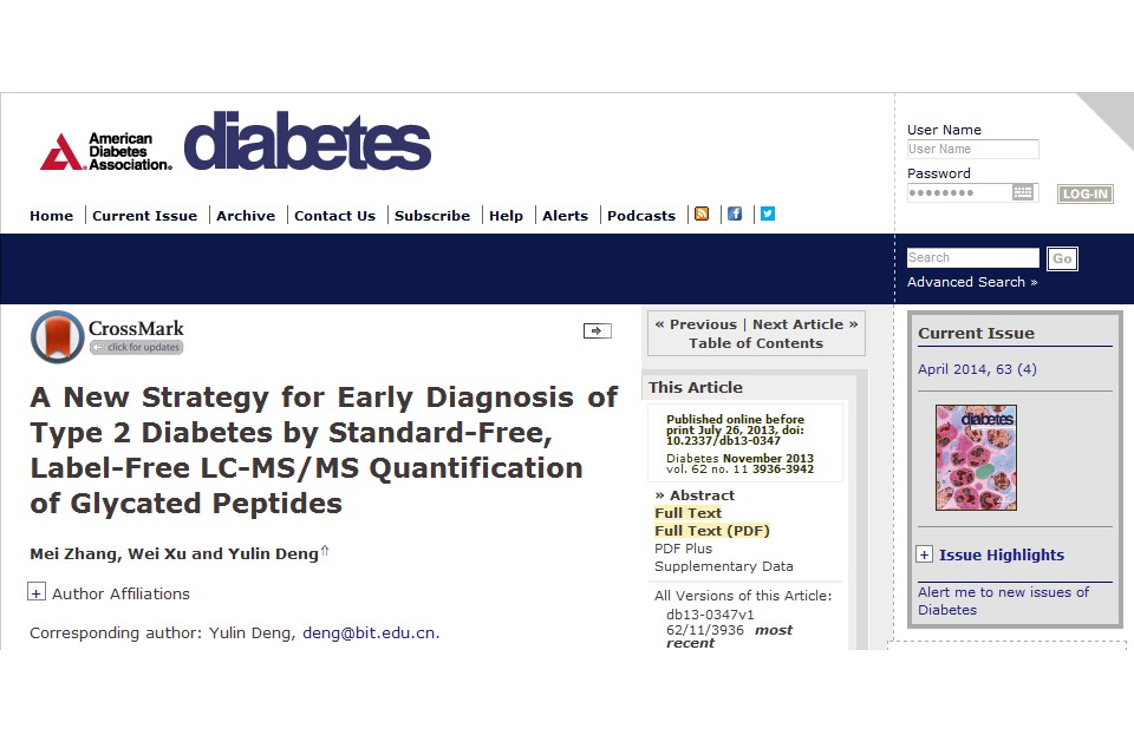 基于該研究成果,由生命學院鄧玉林教授、徐偉教授和張玫博士撰寫的研究論文《A New Strategy for Early Diagnosis of Type 2 Diabetes by Standard-Free, Label-Free LC-MS/MS Quantification of Glycated Peptides(2型糖尿病無標定、無標記定量糖基化肽高效液相色譜質(zhì)譜早期診斷新策略)》已被糖尿病研究領域的頂級期刊《Diabetes》接收并發(fā)表,在生命科學與臨床醫(yī)學領域形成了重要影響。