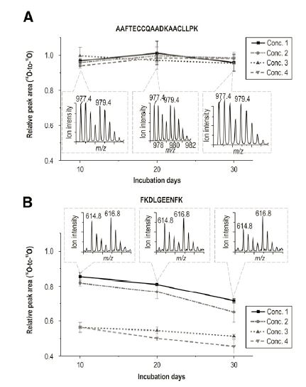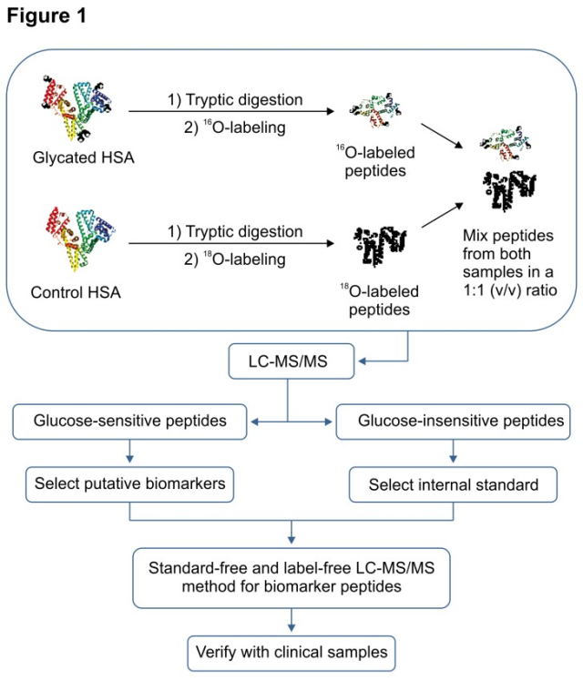 在具體的實驗研究中,生命學院的師生們首先以標準人血清白蛋白與葡萄糖建立體外模擬糖基化模型,酶切后通過18O標記的方法,經(jīng)高效液相色譜質(zhì)譜(LC-MS/MS)定量檢測后分別篩選出葡萄糖敏感肽段和葡萄糖不敏感肽段。葡萄糖敏感肽段即為初步篩選出的候選生物標志物,而葡萄糖不敏感肽段因不易被葡萄糖修飾,可在下一步的血漿樣本驗證中被用作“內(nèi)標”肽段,用以衡量其它葡萄糖敏感肽段的變化程度,從而進一步篩選出有望作為糖尿病早期診斷的生物標志物。