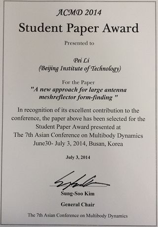 會議期間,經(jīng)過國際同行專家嚴(yán)格評審,胡海巖教授指導(dǎo)博士生李培完成的論文“A new approach for large antenna mesh reflector form-finding”獲得學(xué)生論文獎(共5名,中國學(xué)生1名)。