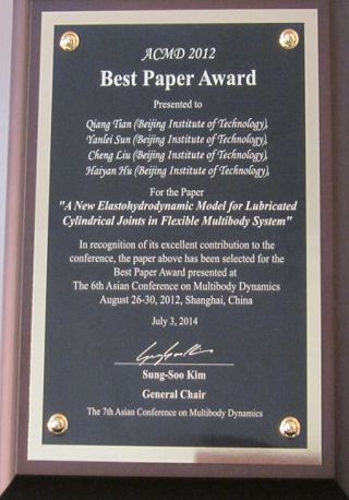 本次大會還頒發(fā)了2012年第6屆ACMD會議的最佳論文獎(共3名,中國學(xué)者1名),由田強(qiáng)副教授等聯(lián)合撰寫的論文“A new Elastohydrodynamic Model for Lubricated Cylindrical Joints in Flexible Multibody System”獲此殊榮。