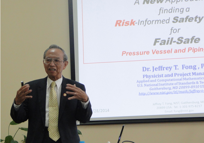 2014年8月29日,應(yīng)機(jī)械與車(chē)輛學(xué)院徐春廣教授邀請(qǐng),美國(guó)國(guó)家科技標(biāo)準(zhǔn)研究院資深學(xué)者、美國(guó)費(fèi)城德雷塞爾與加州斯坦福兩所大學(xué)客座教授、美籍華人方資慧博士來(lái)我校先進(jìn)加工技術(shù)重點(diǎn)學(xué)科實(shí)驗(yàn)室進(jìn)行訪問(wèn)交流。訪問(wèn)期間,方博士參觀了機(jī)械與車(chē)輛學(xué)院的檢測(cè)與控制研究所,并為師生作了題為“A New Approach to finding a Risk-informed Safety Factor for Fail-Safe Pressure Vessel and Piping Design”的學(xué)術(shù)報(bào)告。方博士通過(guò)介紹“應(yīng)用數(shù)學(xué)”、“應(yīng)用物理”、“應(yīng)用物理”三門(mén)科技理論,闡述“無(wú)損探傷數(shù)量工藝技術(shù)學(xué)”的內(nèi)涵。同時(shí),方博士還為我們展示了統(tǒng)計(jì)分析軟件以及如何應(yīng)用現(xiàn)代統(tǒng)計(jì)學(xué)結(jié)合統(tǒng)計(jì)分析軟件進(jìn)行實(shí)驗(yàn)設(shè)計(jì)。方博士的語(yǔ)言詼諧、幽默、生動(dòng),報(bào)告的內(nèi)容引起與會(huì)師生的濃厚興趣,展開(kāi)了熱烈的討論。