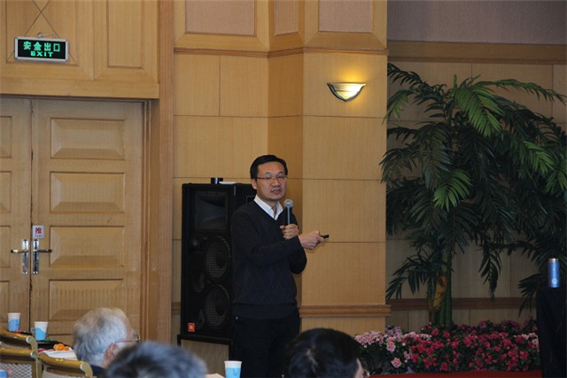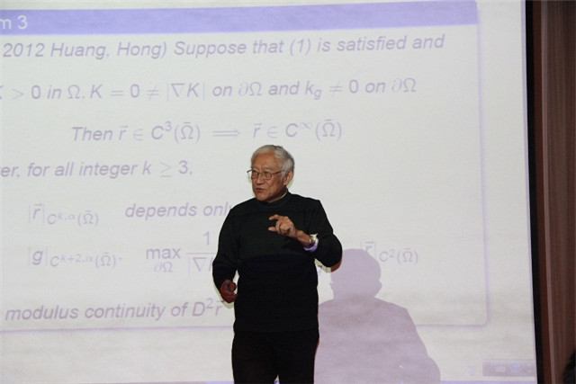 洪家興院士報(bào)告的題目是“regularity of solutions to degenerate elliptic Monge-Ampere equations”。橢圓 Monge-Ampere 方程是偏微分方程研究領(lǐng)域的熱點(diǎn)問(wèn)題之一,許多國(guó)內(nèi)外著名學(xué)者,包括丘成桐教授、Pogorelov教授、Spruck教授等都針對(duì)此類問(wèn)題進(jìn)行了大量的研究工作。但關(guān)于退化橢圓 Monge-Ampere 方程解的正則性, 這類問(wèn)題比較困難,一般性結(jié)果也相對(duì)較少。洪院士首先介紹了部分學(xué)者的重要研究成果,然后介紹了近幾年自己及其合作者在這一方向的最新研究進(jìn)展,之后對(duì)部分結(jié)果的證明過(guò)程及所用的數(shù)學(xué)工具進(jìn)行了簡(jiǎn)要的說(shuō)明 。
