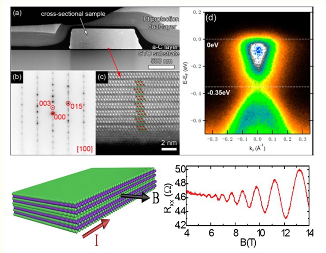 針對(duì)制備好的實(shí)驗(yàn)材料,選取一橫斷面樣本,使用高角度環(huán)形暗場(chǎng)-掃描透射電子顯微鏡(HAADF-STEM)進(jìn)行表征,可以清楚地觀察到沿[100]帶軸的五元組層(QL)的序列−Se−Bi-Se−Bi−Se−的基本單元。利用角分辨光電子能譜(ARPES,利用光電效應(yīng)研究固體的電子結(jié)構(gòu))觀察硒化鉍(Bi2Se3)的表面態(tài)。